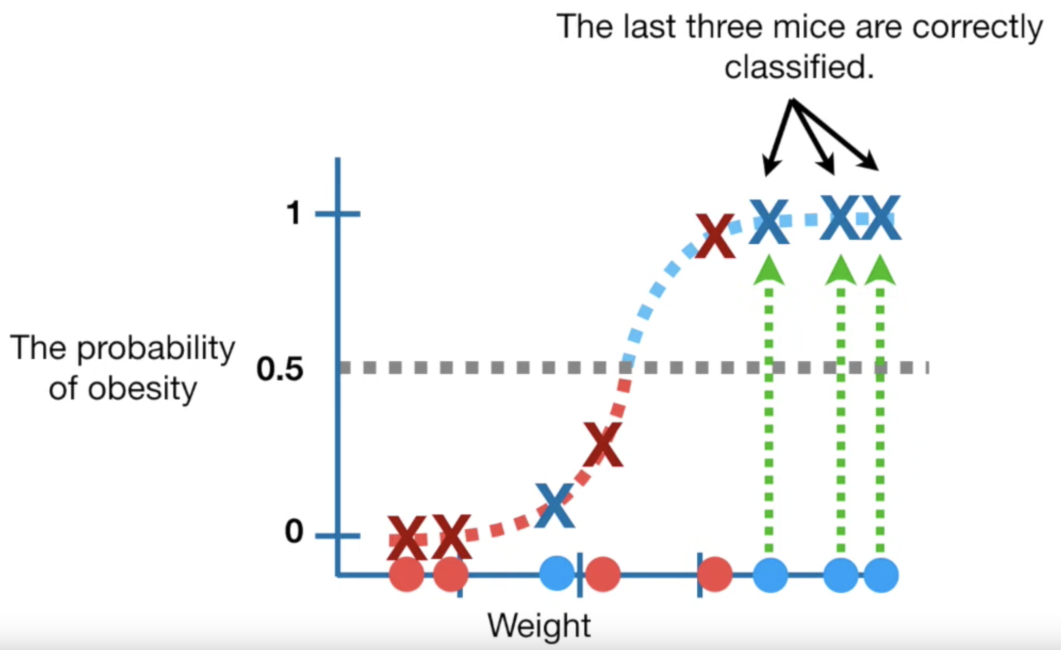 각 데이터는 Logistic Regression 함수 식에 입력되어 0과 1사이의 값 (그래프에서 Is Not Obese 는 0 Is Obese 는 1이다) 으로 예측될 것이다.