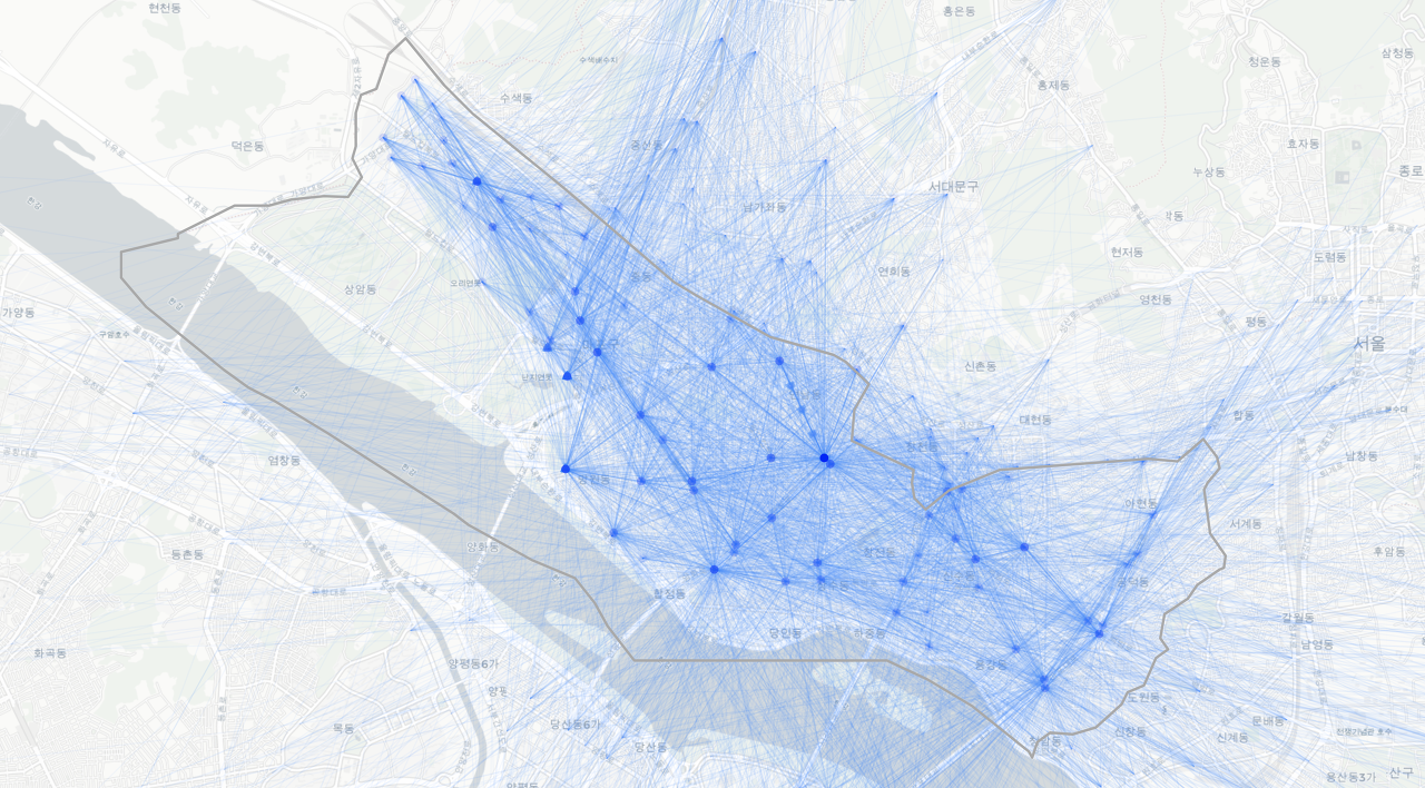 4. 해당 경로를 이용한 량은 선의 투명도로 표현한다. 즉 짙으면 이용량이 많다는 뜻이다.