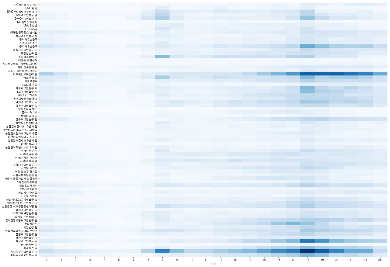 혹시나 놓치는 부분이 있을까봐, 각 대여소 별 이용량 히트맵도 시각화해본다.