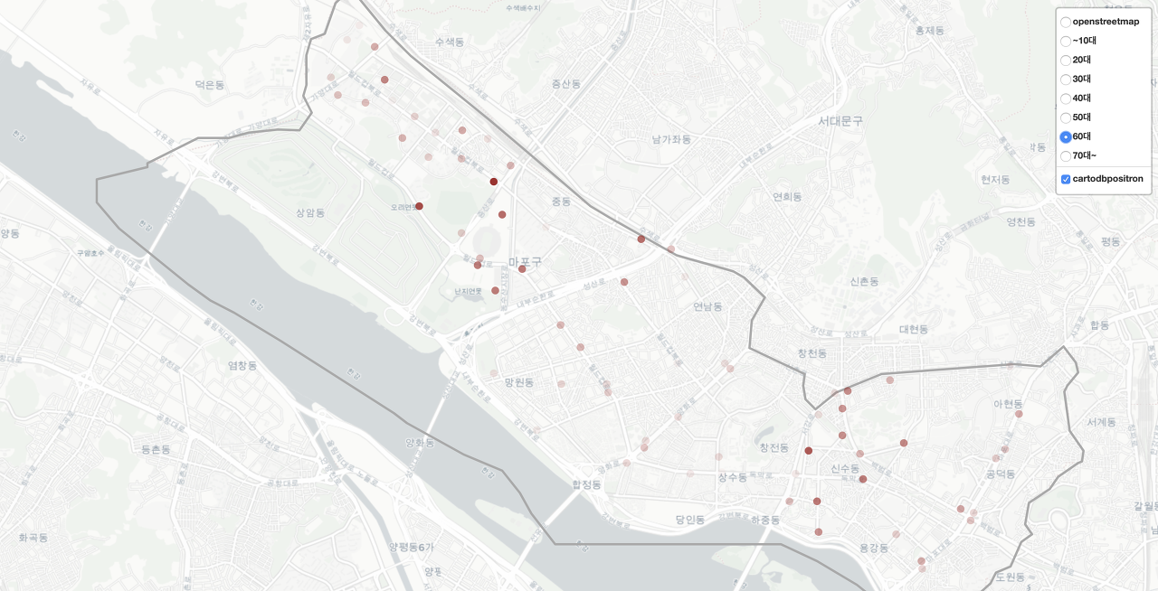 60대의 경우, 마포구청 일대 그리고 창천동 일대에 주로 사용비율이 쏠려있다.